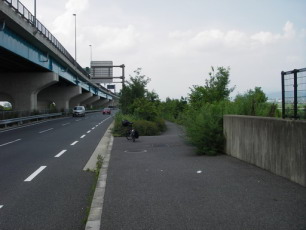 左写真、久御山JCTを越えると、自転車道(歩道)と側道の間に緑地帯が断続的に作られている。