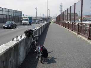 左写真、前方の赤い桁橋は国道1号の木津川大橋。