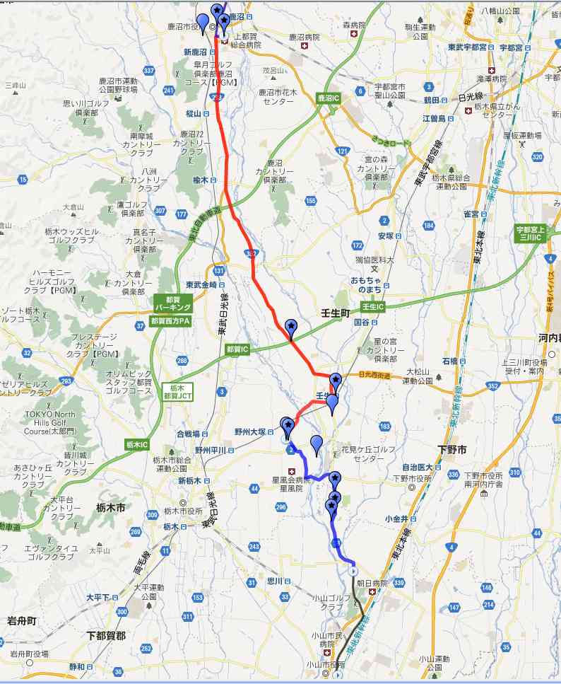 太青線は、室の八島までの走行ルートであり、昼食休憩後、赤太線で新鹿沼の宿まで走った。