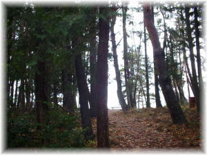 右写真、展望所の直前。赤松林の先に簡素なベンチの影が見えている。向こうは冬琵琶湖。